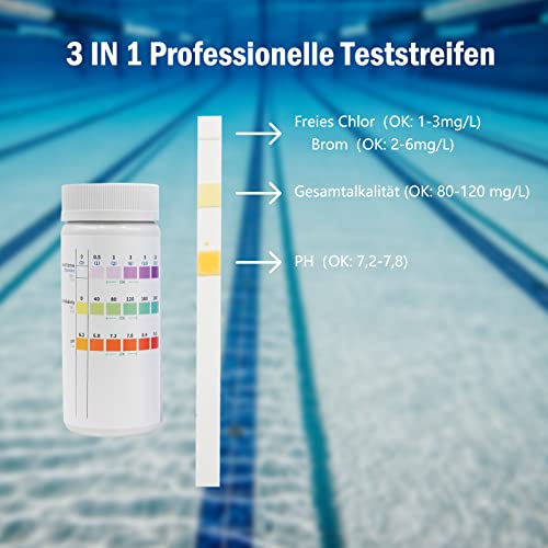 【Sicherheitsgarantie statt dessen die Wasserqualität】 Das3-in-1-Teststreifen-Kit wurde speziell statt dessen Whirlpools und Whirlpools im Pool entwickelt, die schnelle und zuverlässige Ergebnisse zur Schlusswort der Wasserqualität abliefern können. Es kann 3 Elemente im Schwimmbad gleichzeitig erfassen, als z. freies Chlor, Brom, Gesamtalkalität und pH-Wert.
