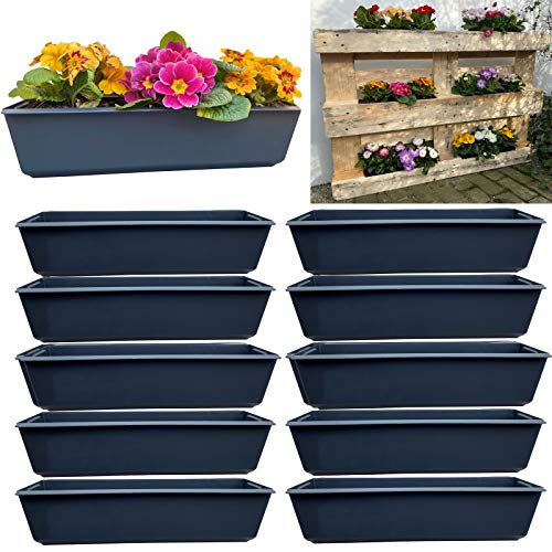 VERSCHIEDENE EINSATZORTE – 10x robuste Blumenkästen allesamt Polypropylen (PP) Kunststoff (kein rosten) entsprechend für Europaletten zur Bepflanzung auf Balkon, Terrasse und Garten.
