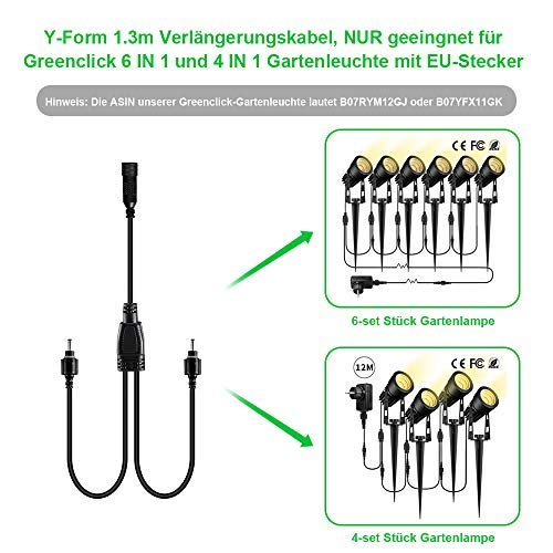 Y-förmiger Verlängerungskabel Angebracht zugunsten Gartenprodukte der Marke GreenClick, einschließlich 4-in-1-Gartenleuchten (B07YFX11GK), 6-in-1-Gartenleuchten (B07RYM12GJ), 6er-Pöbel Rasenlicht (B087Q983QR).