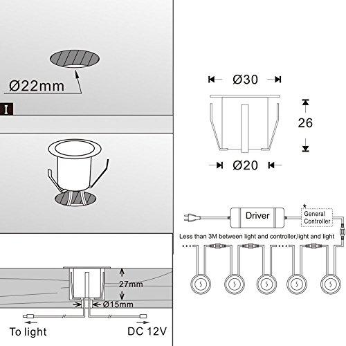 Abmessungen: Durchmesser 30mm * Höhe 26mm. 2.2M langes Stromkabel, maximaler Distanz zwischen 2 Leuchten ist 1m.