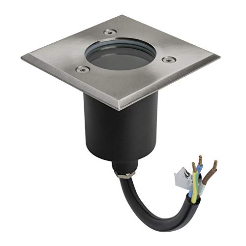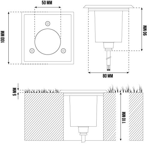 ca. 20cm vormontiertes Erdkabel – Außendurchmesser Blende: 100mm x 100mm – Einbautiefe: ca. 90mm – Durchmesser Körper: 70mm