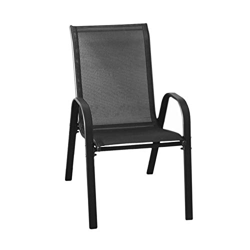 Zwei bequeme Gartenstühle zeigen im Zuge ihre elastische Bespannung jedweder schwarzem Textilen höchsten Sitzkomfort.
