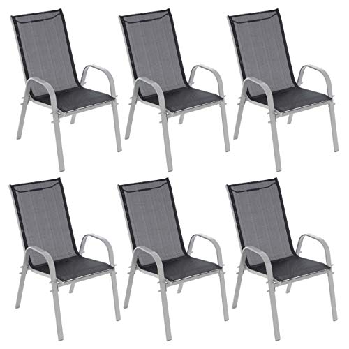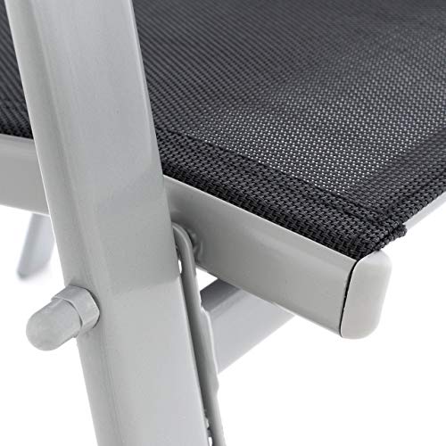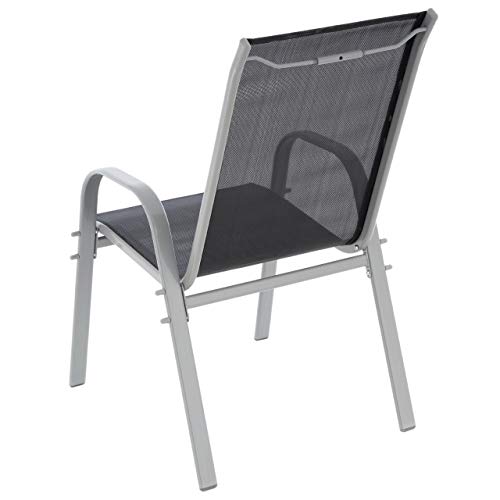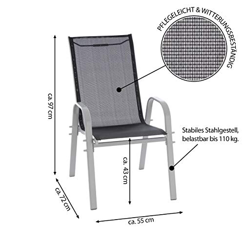 Das Stuhl-Set besteht aus einem doppelt pulverbeschichteten Stahlgestell und ist ideal für den Einsatz im Innenbereich & Außenbereich. Die Kunststoffauflagen an den Füßen schonen den Boden und abschwächen die Geräusche beim Verschieben. Die Sitz- und Rückenflächen der Stühle bestehen aus einer schwarzen elastischen Bespannung aus Textilene. Das ist ein leichtes, robustes Kunststoffgewebe, welche sowohl pflegeleicht ist, als vulgo viele Witterungseinflüsse verkraftet. Für ein entspanntes Abbrummen ist der Gartenstuhl rechts und links mit Armlehnen bestückt.