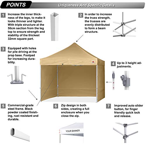 COMMERCIAL CANOPY FRAME UND STOFF: 3×3 m kommerzielle Vollfachwerkstruktur (1 mm dicke quadratische Beine und superstarker Querbinder), größer und stärker, hält starkem Wind stand. 500 Denier Polyester-Baldachin mit spezieller PU-Auskleidung, CPAI-84 feuerhemmend zertifiziert, wasserdicht, UPF 50 +, Block 99,98% schädliche Sonnenstrahlen. Die heißversiegelte Naht, die neueste Technologie in der Branche, verhindert das Eindringen von Wasser allesamt den Nähten.