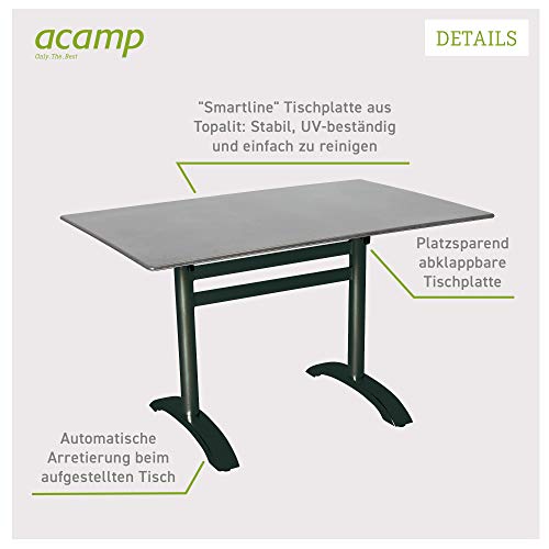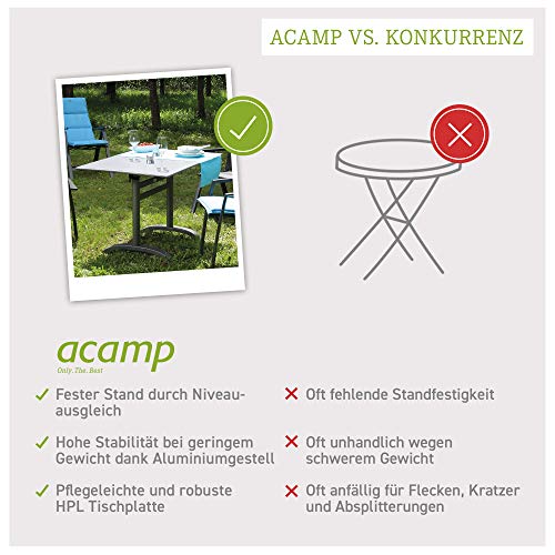 Der Klapptisch Acaplan passt sehr gut zu den Sitzmöbeln für Garten und Terrasse von acamp und kann mit fast allen kombiniert werden. Zaubern Sie mit diesem Gartentisch von acamp einen modernen Aussprache auf Ihre Terrasse oder in den Garten und genießen Sie die Outdoor-Saison in vollen Zügen.