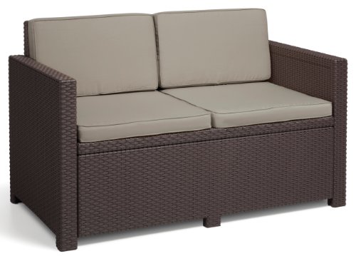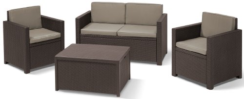 Allibert 220024 Lounge Set Monaco mit Kissenbox-Tisch 2x Sessel und 1x Sofa, Rattanoptik, Kunststoff, braun