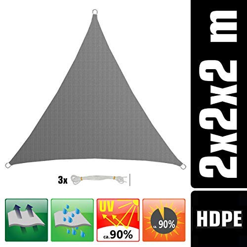 SCHNELLE BEFESTIGUNG – HDPE Sonnensegel, dreieckig, ca. 2 x 2 x 2m – mit eingenähtem Gurt, starken D-Ringen aus Edelstahl und 3 robusten PE Seilen. Im Handumdrehen hat der Spielplatz ein Schutzdach!
