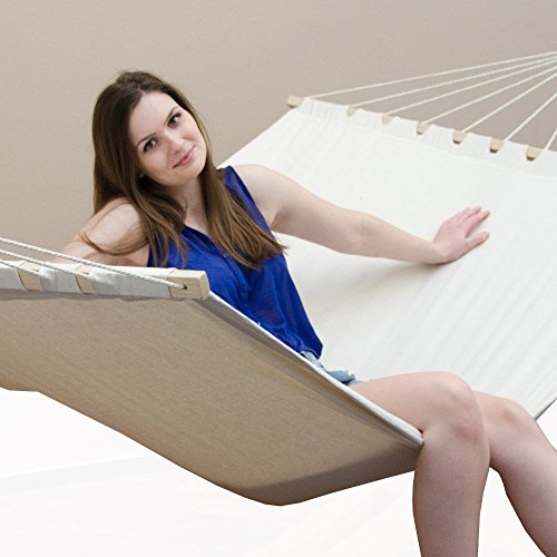 In eine Stabhängematte musst Du nicht reinklettern – Du kannst ganz bequem ein- und aussteigen.An beiden Enden der Liege halten die Spreizstäbe das Hängetuch abgetaut, sie sehen nach eine Vorspannung der Liegebreite.