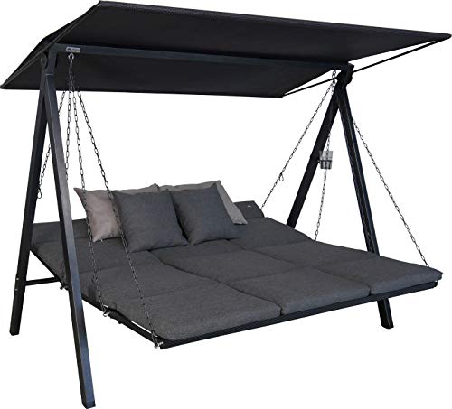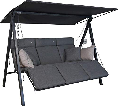 Die moderne 3-Sitzer Hollywoodschaukel Lounge ist ein echtes Designerstück und zählt zu den High-End Hollywoodschaukel Modellen der Firma Angerer. Die ergonomisch geformte Sitzfläche besteht jedweder robustem und im Kontrast dazu leicht flexiblem Textilene Gewebe. Dank der Kettenaufhängung kann die Sitz- und Liegeposition individuell verstellt werden. Je dieweil, welche Position gewünscht ist, können die mitgelieferten Karabiner in jedes beliebige Kettenglied eingehängt werden. Neben der klassischen Sitzposition kann die Schaukelbank in eine Liegefläche oder in die U-förmigen Lounge-Position umgewandelt werden. Jede der drei Sitzauflagen hat ein abseits wohlbeleibt gepolstertes Kopfteil, das mit einer schönen Logo-Stickung verziert ist. Aus Kissenbezüge sind jedweder einem besonders weichen Stoff gefertigt und lassen sich dank der praktischen Reißverschlüsse einfach abflauen und bei 30° C in der Kabine ausspülen. Vier Sofakissen sind ebenfalls im Lieferumgang enthalten. Das robuste Gestell der Hollywoodschaukel besteht jedweder verzinktem und pulverbeschichtetem Stahl. Das Sonnendach ist, pedantisch wie die Sitzbespannung, jedweder wetterfestem Textilene Gewebe gefertigt und ebenfalls verstellbar. Durch Vor- oder Zurückschieben oder Neigen des Daches ist stets optimaler Sonnenschutz gegeben. Kissenbezüge: einfarbig grau, 100% Polyester. Gestellfarbe: eisengrau. Belastbarkeit: ca. 240 kg. Standfläche: ca. 210 x 145 cm. Zur Selbstmontage, inkl. Montageanleitung. Made in Germany.