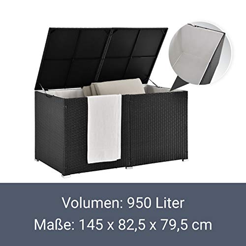 ✅ Stauraum – 145 x 82,5 x 79,5 cm große Polyrattan Auflagenbox schwarz mit ca. 950L Fassungsvermögen für Garten, Terrasse oder Balkon; perfekt zur Aufbewahrung von Auflagen, Kissen & Gartenzubehör
