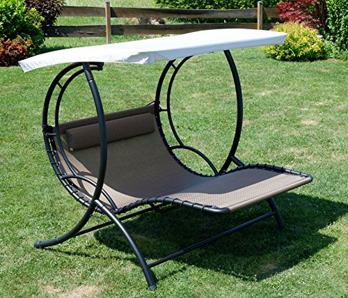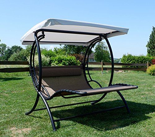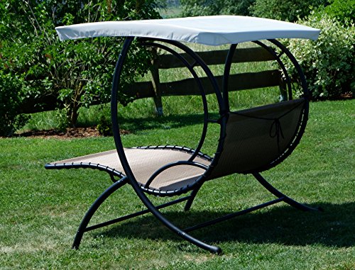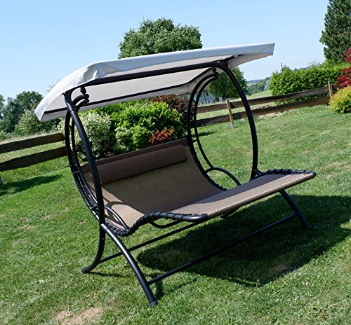 – Liegeflächenbespannung nicht mehr da wasserdurchlässigen strapazierfähigem Kunststoffgewebe mit Kopfpolster, pflegeleicht, UV-resistent, mit Sonnenschutzdach