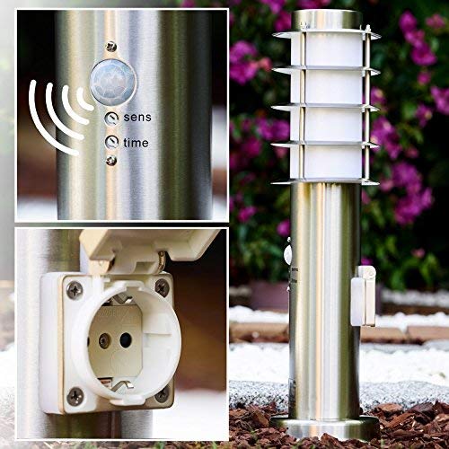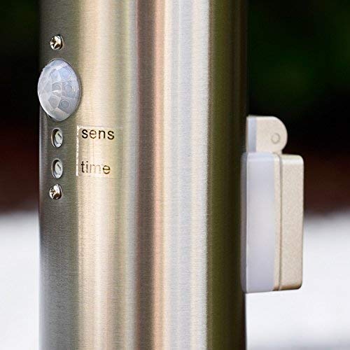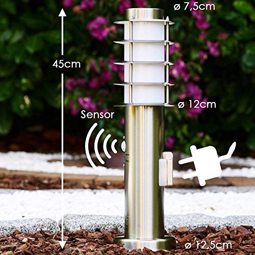 Mit dieser Außenstehleuchte bekommen Sie eine dekorative Gartenbeleuchtung auf Ihr Grundstück, das selbst am Tage zum echten Hingucker wird. Die zylinderförmige Aussenlampe aus Edelstahl wird von einer silbernen spirale umlaufen. Im eingeschalteten Zustand der Säule für den Garten sorgt dies für zusätzliche Lichteffekte. Im Inneren der Outdoor Wegeleuchte befindet sich eine E27 Edition, in der Sie ein Leuchtmittel Ihrer Angleichung unterstützen können. Durch den weißen Kunststoffteil der Garten Leuchten wird ein indirektes Licht erzeugt, das in den Abendstunden für eine atmosphärische Stimmung sorgt. Eine Unregelmäßigkeit ist der Bewegungsmelder mit einer Reichweite von bis zu 8 Metern und einem Erfassungswinkel von 120 Tönung. Dadurch sparen Sie Strom, wenn die Lampe gerade nicht im Einsatz sein muss und haben außerdem eine kleine Abschreckung für ungebetene Gäste vor der Haustür.