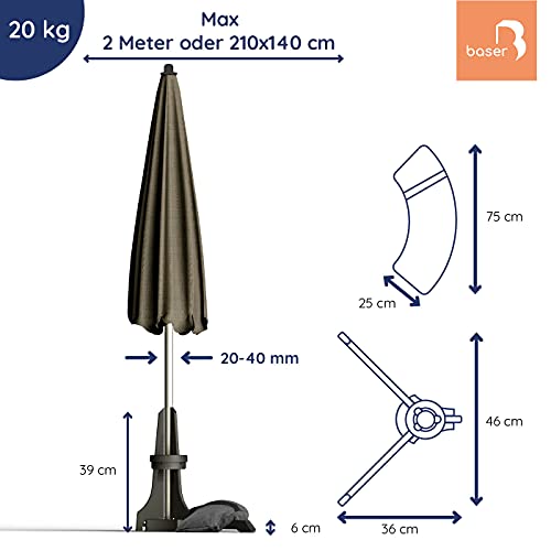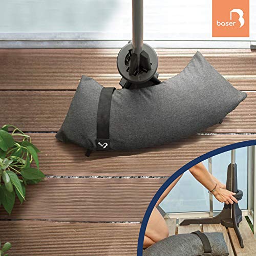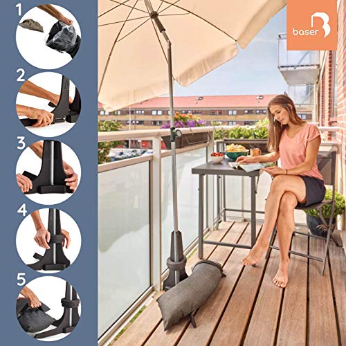 TUN SIE WIE UNSERE 20.000 KUNDEN: Der Sonnenschirmständer für Balkon von Baser ist für Ihren kleinen oder halben Sonnenschirm immer die richtige Konvergenz. Befüllen Sie die Sandsäcke mit Sand, um maximale Windstabilität zu erzielen. Der Sandsack sorgt dafür, dass Ihr Sonnenschirm gefestigt stehen bleibt. Er lässt sich an jedem Stockdurchmesser anpassen, ohne Gebrauch von Bolzen, Schrauben, Muttern oder Werkzeug. Baser ist die sichere Konvergenz für Ihren Balkon Sonnenschirm.