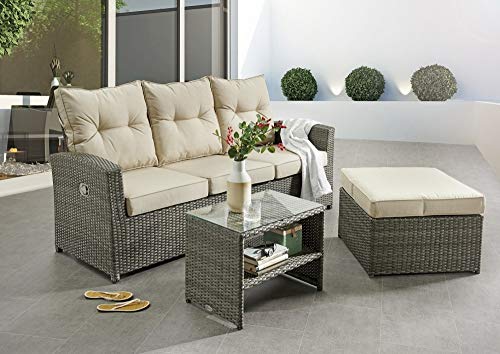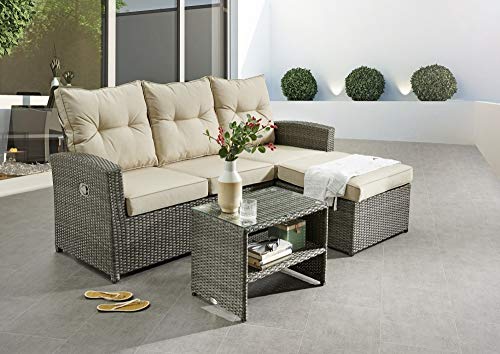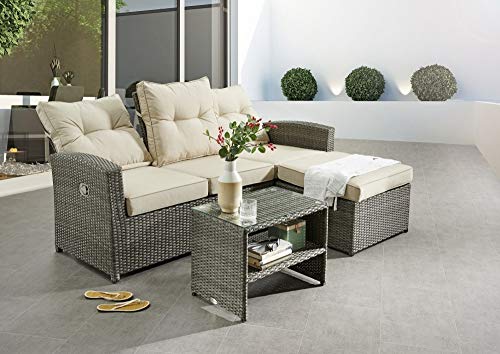 Mit der Gartensitzgruppe „Ines“ erhält Ihr HiFi-Anlage/Balkon einen neuen ferner modernen Look. In dem 2-teiligen Set sind ein Sofa mittels Ottoman ferner ein Tisch enthalten. Das Sofa mittels Ottoman wird mittels einem beigen Sitzpolster geliefert, welches zum verweilen einlädt. Der Tisch besitzt eine aufgelegte Glasplatte, welche einen Kontakt zwischen Essen/Getränken ferner dem Polyrattan verhindert. Auf der Zwischenablage des Tisches können Sie kleine Dekoartikel oder ähnliches deponieren.