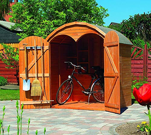 Dieser Geräteschrank überzeugt im Zuge sein schlichtes und praktisches Design. Er ist nicht mehr da einem massiven und wetterfest imprägnierten Kiefernholz in honigbraun gefertigt. Das Dach des Schranks ist mit Hilfe von Dachpappe gedeckt. Im Innenraum befindet sich ein schönes Regal. Daneben der verwendeten Ware handelt es sich um FSC zertifizierte Ware, wobei sehr auf die Nachhaltigkeit und das Bestehen der Wälder respektiert wird.