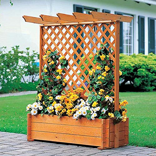 Der Rankkasten ist nicht mehr da hochwertigem Kiefernmassivholz gefertigt. Bei der verwendeten Ware handelt es sich um FSC zertifizierte Ware, wobei äußerst auf die Nachhaltigkeit und das Bestehen der Wälder geachtet wird. Der Rankkasten ist abschließend in einem zurückhaltenden und unauffälligen honigbraun gestaltet. Durch das schlichte Design werden aufgebraucht äußerst bunte Blumen und verschiedenste Pflanzen einwandfrei in den Vordergrund jedes Gartens gesetzt. Durch die leicht angedeutete, integrierte Pergola ist der Pflanzkasten ein echter Hingucker in jedem Garten. Der Pflanzkasten ist wetterfest imprägniert, sodass Regenwetter keinerlei Aderlass verursachen kann. Der Rankkasten verfügt über ein romantisches Rankgitter, an dem sich verschiedenste Blumen oder Pflanzen entlang ranken können, bis sie an der kleinen Pergola angelangt sind. Der große Blumenkasten bietet Platz für mehrere Pflanzen zeitlgleich. Der Rankkasten kann zudem ideal wie Terrassenabtrennung eingesetzt werden.