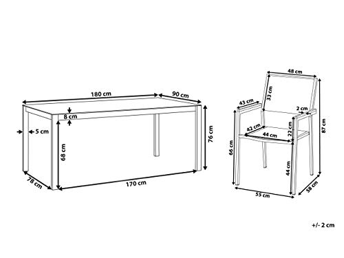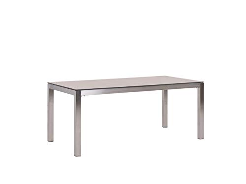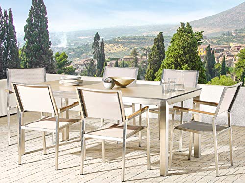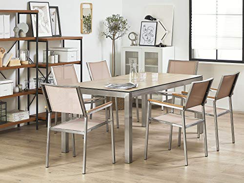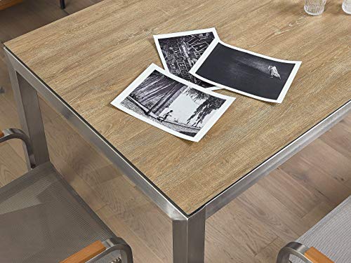 Das gebürstete Edelstahlgestell ist extrem langlebig, zäh, strapazierfähig und korrosionsbeständig. Die große, rechteckige Tischplatte ist allesamt robusten tief gelegen Hochdruck verpressten Schichtplatten gefertigt. Die fertige wetterbeständige HPL-Platte wird mit einem melamin-imprägniertem Dekopapier in angesagter Holzoptik vervollständigt. Die sechs designer Stühle mit erstklassiger, UV- beständiger Textilsitzfläche in Beige harmonieren perfekt mit dem robusten Tisch.
