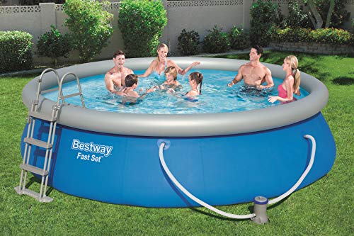 Der Pool von Bestway macht den Sommer zum einem einmaligen Badeerlebnis im Garten. Der Aufbau auf einer ebenen Standfläche ist kinderleicht, es muss aber der Luftring aufgeblasen und dann Wasser eingefüllt werden. Beim Einfüllen stellt sich der Pool dann von alleine auf. Er besteht aus strapazierfähigem TriTech Material. Dieweil handelt es sich um ein dreischichtiges, verstärktes Material mit einem Kern aus Polyester, der von zwei hochdichten PVC-Schichten umgeben ist. So werden eine außerordentliche Stärke und lange Haltbarkeit gewährleistet. Nach der Saison ist der Swimmingpool schnell abgebaut und kann platzsparend gelagert werden. Das integrierte Ablassventil kann einfach mit dem mitgelieferten Anpassungseinrichtung an einen Gartenschlauch angeschlossen und das Wasser so unkompliziert und schnell abgelassen werden. Schneller und einfacher geht´s nicht. Fast Set Pools sind die Turbolader-Pools unter den Aufstellbecken. Erhältlich mit einem Fassungsvermögen von 2.300 bis zu 12.400 Litern bereiten sie unkomplizierten Badespaß in jedem Garten mit einer ebenen Aufstellfläche. Das Wasser des Swimmingpools ist durch die im Set enthaltene Pumpe mit einer Leistung von ca. 2.006 Liter pro Stunde dauerhaft klar und frisch. Im Lieferumfang befindet sich ungeachtet alledem ein selbstklebender Unterwasser-Reparaturflicken. Bei 80 % Füllung hat das Schwimmbecken eine Wasserkapazität von 12.362 Litern.