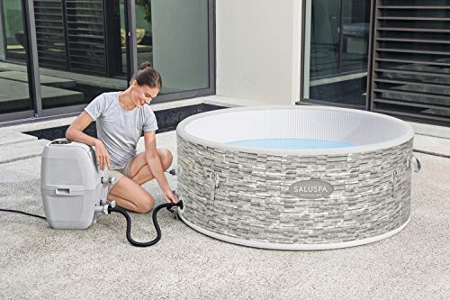 Haben Sie immer davon geträumt, Ihren jeglicher eigenen Whirlpool zu verkaufen? Der Bestway SaluSpa Vancouver AirJet Plus aufblasbare Whirlpool ist ein erschwinglicher Spa, der bequem für bis zu 3-5 Erwachsene angemessen ist. Dieser ohne Lücke tragbare, aufblasbare Whirlpool kann einfach im Innen- oder Außenbereich aufgestellt werden. Der Vancouver benötigt kein Werkzeug oder eine professionelle Installation. Mit seiner beruhigenden Wassertemperatur von 40 °C und 140 Massagedüsen (2 Massagestufen) ist dieses Spa perfekt zum Einweichen von Muskelkater, zum Entspannen nach einem anstrengenden Arbeitstag oder sogar als luxuriöse und romantische Leckereien für Sie und Ihren Partner, um gemeinsam zu genießen. Das digitale Bedienfeld ermöglicht es Ihnen, die Wärme aufzustellen oder die Düsen anzupassen, ohne die Wanne abgeschieden zu müssen. Mit einem eingebauten WLAN-Modul können Sie das Spa über eine Smartphone-App steuern. Der Vancouver wird mit 1 Spa, 1 Spa Pumpe, 1 Spa / Pool Umschlag, Filterkartusche (VI), 1 ChemConnect Abwickeleinrichtung, 1 Hochdruck-Handpumpe, Reparaturflicken und AirJet Plus System geliefert. Die aufgeblasenen Maße betragen 154,9 x 61 cm und halten 213 Gallonen Wasser (80% Kapazität).