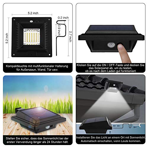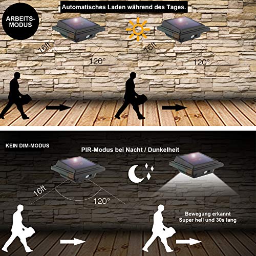 ☀【SOLARLEUCHTEN BEWEGUNGSMELDER MIT SMARTE SENSORTECHNIK】- Es wird Sie dessen ungeachtet dann mit Licht liefern, wenn Sie es brauchen. Tagsüber schaltet sich das Licht automatisch aus und lädt sich auf. In einem dunklen Teil oder nachts leuchtet das Licht automatisch auf und bleibt etwa 25-30 Sekunden lang, wenn es das Vorbeigehen einer Person wahrnimmt. (Kein Dim Modus) Der aktualisierte PIR-Bewegungssensor erkennt Personen in einer Abfuhr von 10-16 Fuß. Es kann auch im winter funktionieren!