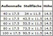 Maße ca.AußenmaßeStellflächeHöhe40 x 17,5 cm34 x 11,5 cm14,5 cm50 x 17,5 cm43,5 x 11,5 cm14,5 cm60 x 17,5 cm53,5 x 11,5 cm14,5 cm80 x 17,5 cm73,5 x 11,5 cm14,5 cm100 x 17,5 cm93,5 x 11,5 cm14,5 cm