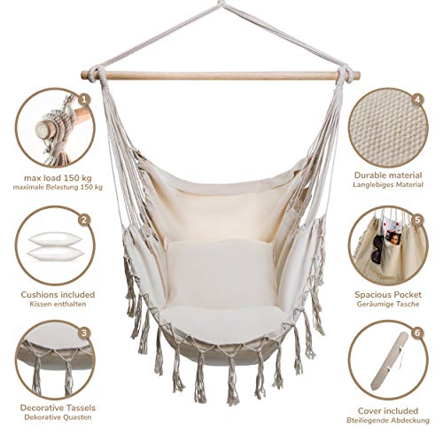 BOGATECO Hängesessel mit 2 Kissen | Hängestuhl für Erwachsene & Kinder | Belastbar bis 150 kg | Hängesitz für Indoor…