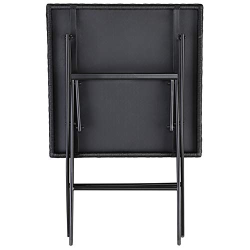 PRODUKTDETAILS – Maße (LxBxH): 63x63x73 cm // Klappmaße: 64x12x100 cm // Belastbarkeit: 60 kg // Gewicht: 5 kg // Material Geflecht: Polyrattan // Material Gestell: galvanisierter, pulverbeschichteter Stahl // Farbe: Schwarz