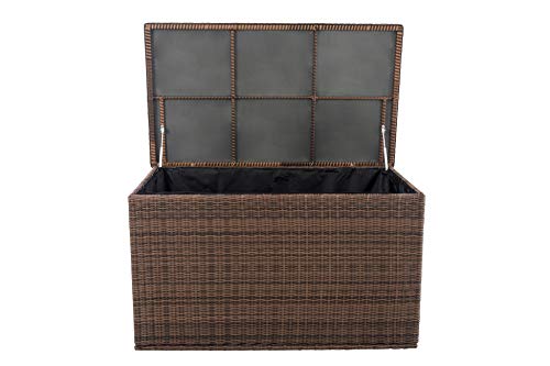 Die Aufbewahrungsbox Comfy ist eine edle und funktionale Truhe für die Polsterauflagen der Gartenmöbel. In der Box sorgt ein Regenschutz mit Reißverschluss für Trockenheit. Somit sind die Auflagen wasserdicht von allen Seiten geschützt. Der Regenschutz ist einfach mit Klettverschluss zu verankern und wiederholt abzunehmen. Die Kissenbox lässt sich durch einen oben angebrachten Deckel einfach öffnen und deduzieren. Für praktische Unterstützung und zusätzliche Stabilität sorgen zudem die beiden Gasliftdämpfer am Deckel der Gartentruhe.