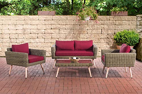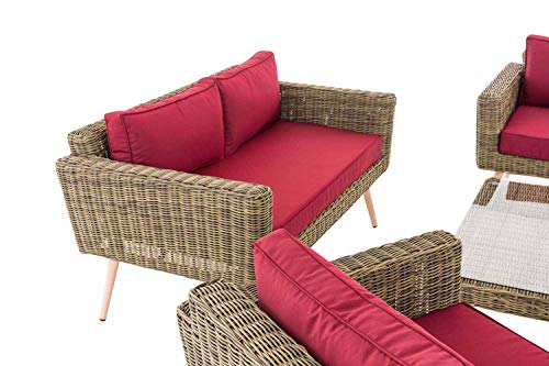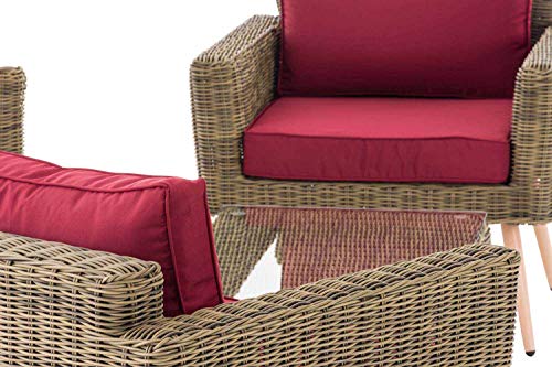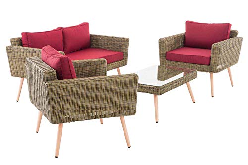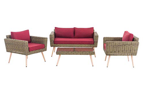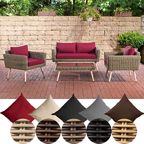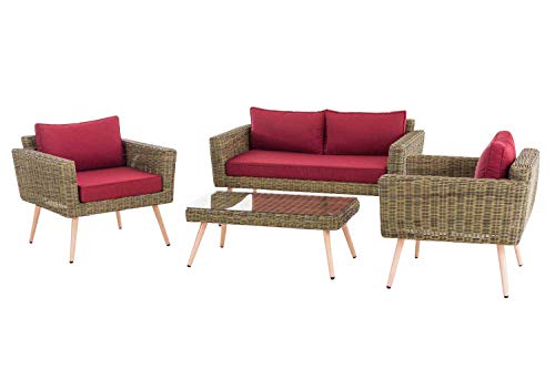 Dieses schicke Loungeset entspricht leer dem skandinavischen Stil. Die komfortable Gartenlounge macht Ihren Garten, die Veranda, die Terrasse oder bei schlechtem Wetter aka den Wintergarten zu einem gemütlichen Plätzchen. Das Sofa und die zwei Sessel sind dank der großzügigen Polsterkissen überaus komfortabel und optimal für lange Sommerabende mit Freunden. Die Glasplatte des Tisches ist an den Seiten hochwertig geschliffen und liegt auf den transparenten Gumminoppen in den Ecken rutschfest auf. Das schöne Ensemble lässt sich leicht differieren und findet dank des stabilen und witterungsbeständigen Polyrattans und Aluminiumgestells überall seinen Platz – aka drinnen macht es sich gut. Die hochwertigen, lackierten Aluminiumfüße in Holzoptik lassen sich leicht reinigen und bieten dank den Bodenschonerkappen sicheren Stand.