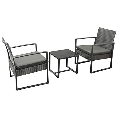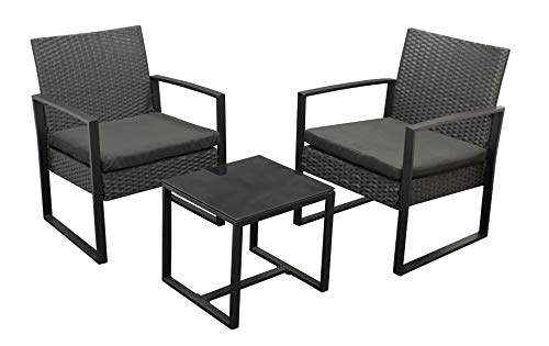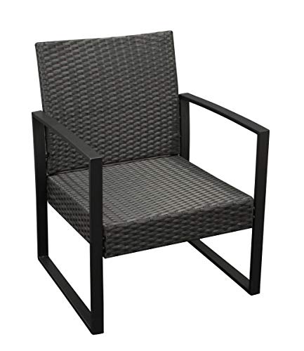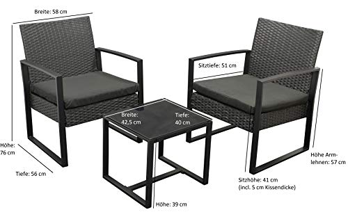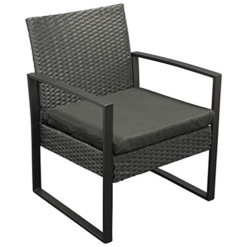 Die Sessel zeigen ein solides Metallgestell unter anderem eine wetterfeste Polyrattanbepsannung. Das Gestell ist schwarz pulverbeschichtet, die Sessel aufreihen zur Hügel des Sitzkomforts unter Einsatz von Armlehnen. Im Lieferumfang sind Gleichfalls zwei Sitzpolster in der Farbe schwarz umschließen. Materialzusammensetzung Bezüge: 100% Polyester.