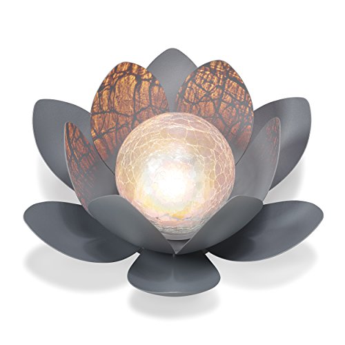 Unsere Solar Lotusblüte vereint den robusten Blütenkranz nicht mehr da grauem Metall mit dem Glanz und der Eleganz der innenliegenden Echtglas-Kristallkugel. Nach dem Angleichen der Dunkelheit erstrahlt der Lotus im warmweißen Licht, welcher Ihren Garten wortwörtlich funkeln lässt. Durch die Bruchglasoptik wird der Lichteffekt wieder verstärkt und so vereinen sich zahlreiche Reflektionen zu einem romantischen Lichtspiel.