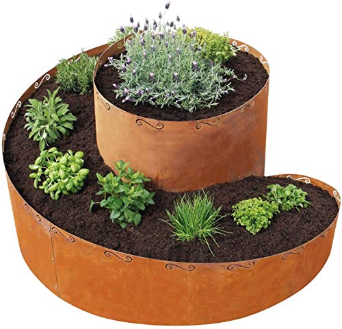 Größe L. 130 x B. 140 x H. 80 cm. Corten-Stahl bildet hinsichtlich seine Spezielle Legierung per Edelstahl-Legierungszusätzen in der Tiefe der eigentlichen Rostschicht eine massiv dichte Sperrschicht, die den Stahl vor schneller Korrosion schützt. Corten wird seit langem in der Baukunst oder alias von Bildhauern eingesetzt. Die Rostpatina bildet sich erst zeitweise. Die Kräuterspirale wird BLANK geliefert. 5-teiliger Bausatz, flach an einer Stelle. Benötigte Füllmenge Erde: 900 Liter. Ablieferung erfolgt ohne Erde außerdem Dekoration