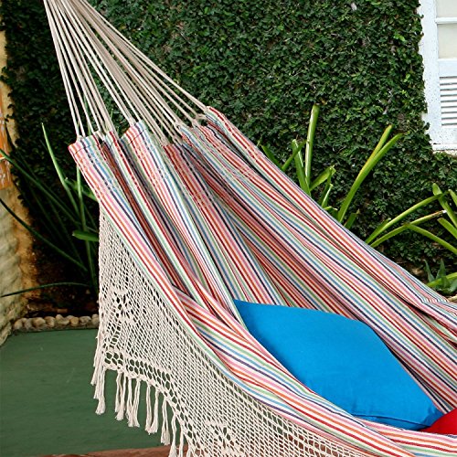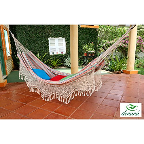 Die Familienhängematte Arco Iris ist eine große Hängematte in natur mit Hilfe von bunten Leicht berühren, mit Hilfe von eleganter Zierborte, sämtliche 100% Baumwolle. Sie wird in Brasilien, dem Land der Hängematten, in hochwertiger Handarbeit produziert. In Bezug auf ihre verstärkte Webkante sind sie außergewöhnlich belastbar. Ihre außergewöhnlich breite Tuchfläche macht die Arco Iris außergewöhnlich komfortabel. Die Kissen sind nicht im Ertrag inbegriffen, können Gewiss verschlossen bestellt werden. Liegefläche: 265 x 170 cm Belastbarkeit: 180 Kg Gesamtlänge: 400 cm