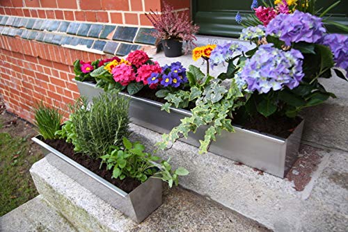 Material: Der matt silberfarbene Pflanzkasten wird aus hochwertigem, industriellen Edelstahl (VA-Stahl) gefertigt; Aufgrund der handwerklichen Anfertigung kann das hochwertige Produkt natürliche Bearbeitungsspuren aufweisen; Das Metall ist rostfrei, frostbeständig und für Draußen geeignet