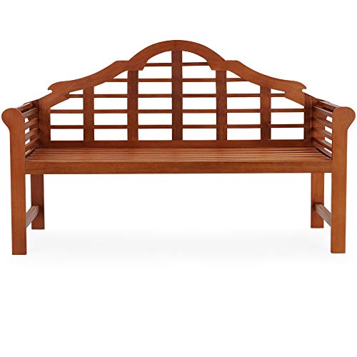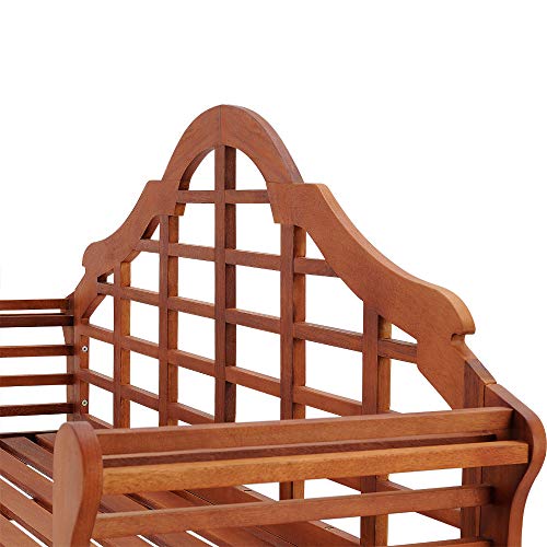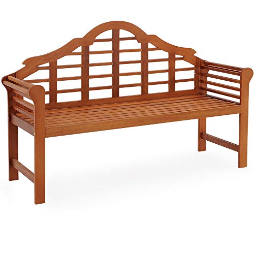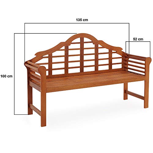 Die Holzbank hat außerordentlich designte Arm- und Rückenlehnen. Also wird die Bank zum Hingucker.