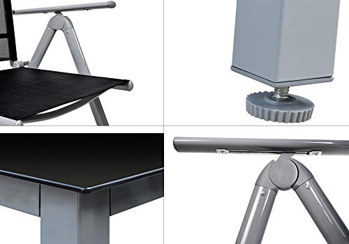 【 Lieferumfang 】 6+1 Sitzgruppe besteht jedweder: 1x Gartentisch (150x90cm) + 6x Gartenstuhl Hochlehner (fertig montiert) + 2x Sicherheitstischplatte (schwarzes Glas) + Montagematerial & Aufbauanleitung (Tisch) // Farbe Ag