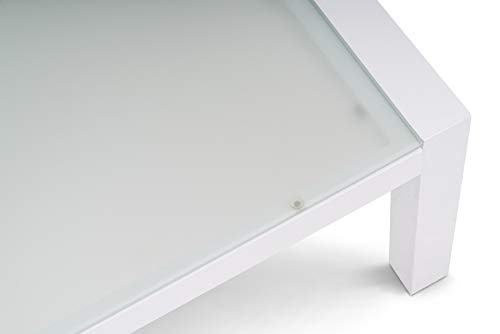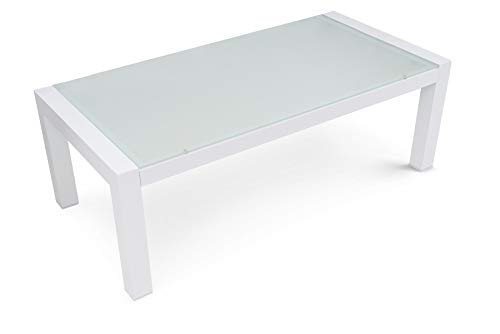 Die Loungegruppe besitzt einen kleinen Couchtisch mit einer 5mm dicken Milchglasplatte, diese ist leicht zu reinigen und vordergründig extrem langlebig.