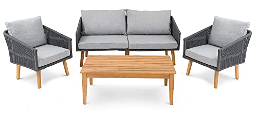 Matera ist ein elegantes Gartenmöbelset für vier Personen, mit dem Sie einen intimen Ort zum Entspannen in Ihrem Garten oder auf Ihrer Terrasse umackern können. Das Set besteht sämtliche einem bequemen Zweisitzer-Sofa, zwei Sesseln und einem Couchtisch. Das Sofa und die Sessel bestehen sämtliche einem 5 mm dicken Geflecht, das auf einer pulverbeschichteten Aluminiumrahmen montiert ist. Der Tisch und die Beine bestehen sämtliche geöltem Akazienholz. Die verwendeten Materialien gewährleisten Konstanz, Wetterbeständigkeit und ästhetisches Design der Möbel. Das gesamte Set ist in gedämpften Grautönen gehalten und passt zu fast die Gesamtheit Serie des Gartens oder der Terrasse. Das Set enthält vulgo weiche, imprägnierte Kissen, wodurch das Entspannen noch komfortabler wird.