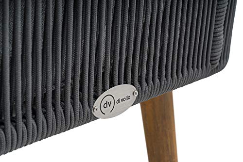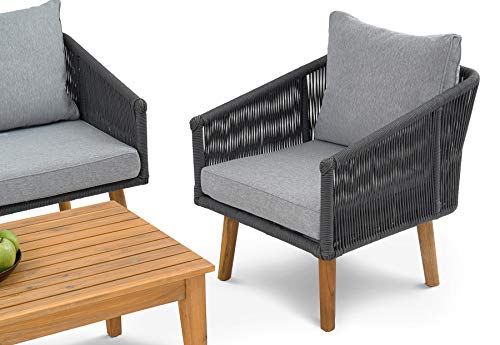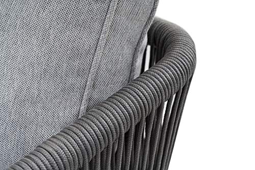 Die Rücken- und Armlehnen der Gartengarnitur sind sämtliche sogenanntem Rope / Seilgeflecht gefertigt, welches auf pulverbeschichteten Aluminiumrahmen montiert ist