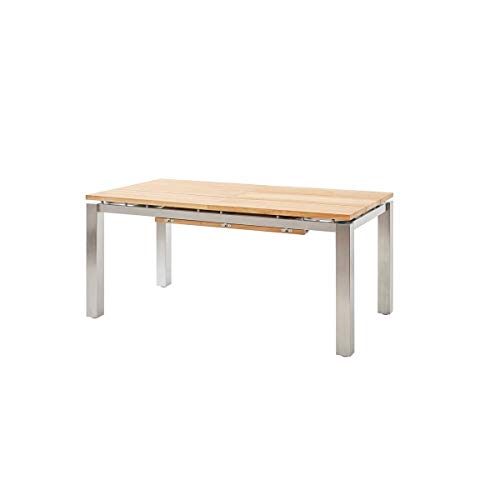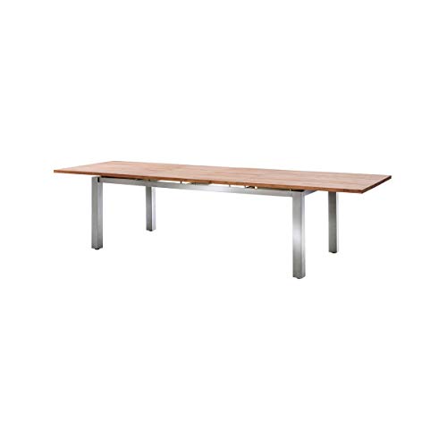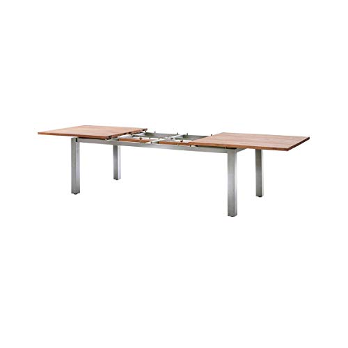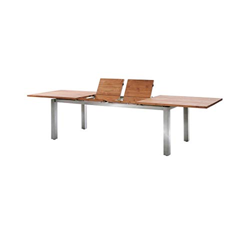 besteht aufgebraucht einem schwerem, gebürsteten Edelstahl-Gestell und einer schwebend aufliegendenTischplatte aus altem, recyceltem Teakholz. Astlöcher, Kerben, Unebenheiten, Ausbesserungsstellen oder Rillen sind holistisch charakteristisch anstatt diese Unikate und hervorheben Ihren außergewöhnlichen, einzigartigen Charme. Die massiven Tischbeine offerieren optimale Standfestigkeit. Der Ausziehtisch verfügt über einen komfortablen Synchronauszug mit Falteinlegeplatte, die je nach Tischgröße aufgebraucht einer oder zwei Platten besteht. Der Gartentisch „Levanto“ ist in den folgenden Größen erhältlich: