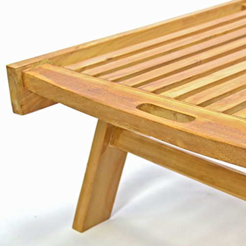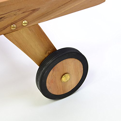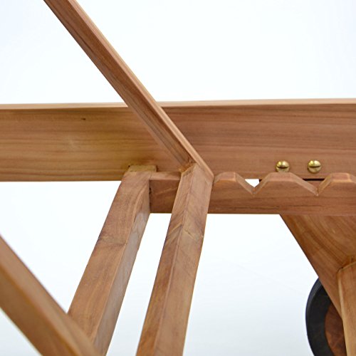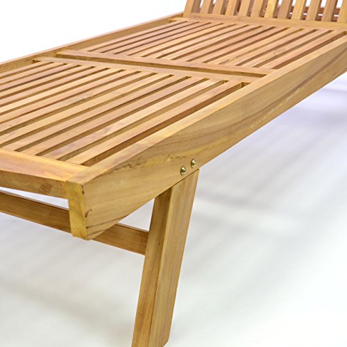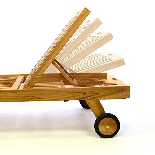 Hochwertige Gartenliege jeder Teak (behandelt), verstellbare Rückenlehne. Für einen leichten Transport sorgen zwei gummiummantelte Räder.