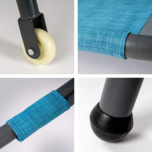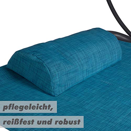 Die blaue Liegefläche ist mit 2×2 670g Textilene bezogen und pflegeleicht, reißfest und robust. Die Belastbarkeit liegt bei etwa 100 Kg.