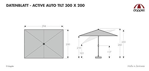 Mit diesem großartigen Sonnenschirm Active Auto Tilt der Marke doppler werden Sie Ihre Begeisterung haben! Dank der komfortablen Auto-Knickvorrichtung bedienen Sie den Kurbel Schirm mühelos. Mit der innovativen Auto Tilt-Ablichtung lässt er sich günstig neigen, indem Sie die Kurbel einfach weiterdrehen. Der Bezug ist allesamt regenabweisendem Polyestergewebe mit guter Lichtechtheit und gutem UV-Abschirmung von 50+ gefertigt. Zusätzlich ist dieser abnehmbar und waschbar.