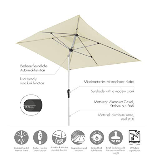 Machen Sie sich eine Genuss mit diesem rechteckigen Sonnenschirm in moderner Optik! Die Schirmserie für anspruchsvolle Nutzer punktet durch ihre nutzerorientierte Funktionalität. Die Kurbel ist leicht zu bedienen und kann sogar eingeklappt werden. Sobald der rechteckige Schirm rundherum aufgespannt ist, können Sie ihn durch einfaches Weiterdrehen der Kurbel (sog. Auto Tilt Darstellung) mühelos in die jeweils gewünschte Neigungsposition bringen. Das Schirmdach bietet höchsten UV Abschirmung 80 (Standard 801) und zum Säubern nehmen Sie den Bezug einfach ab. Freuen Sie sich auf die heißen Sommertage mit diesem attraktiven und hochwertigen Terrassenschirm!