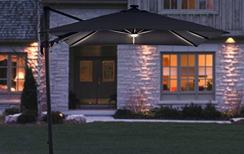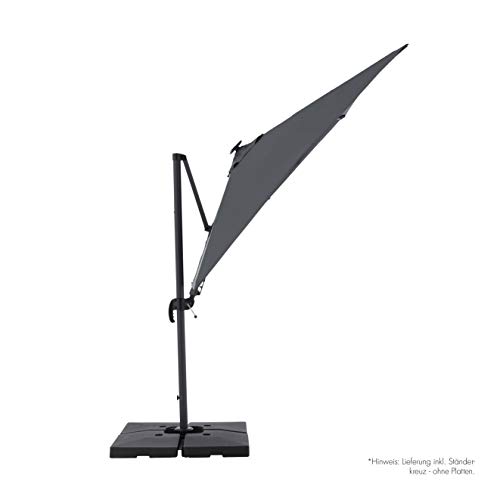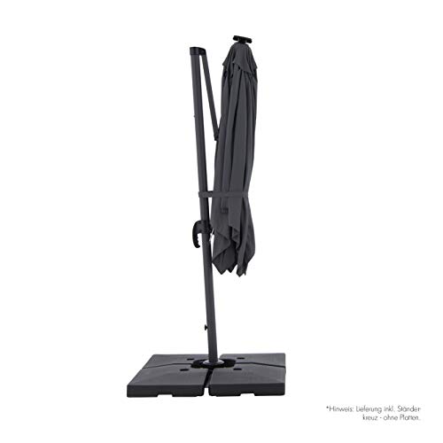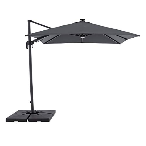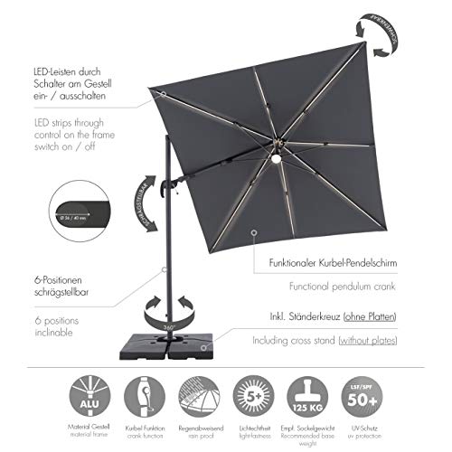 Dieser hochwertige Ampelschirm ist ein wahres Glanzstück auf Ihrer Terrasse. Er verfügt über exklusive Funktionen, wie einzigartige LED-Ausführen an den Streben, die Ihnen ein angenehmes Licht bieten und Sie abends zum Verweilen im Garten einladen. Tagsüber wird der Akku der LED-Ausführen praktisch und umweltfreundlich über ein Solar Panel am Schirmdach aufgeladen. Den Akku können Sie zusätzlich über eine externe Powerbank (nicht im Lieferumfang enthalten) laden. Außerdem können Sie den Kurbelschirm ideal an den Sonnenstand gleichsetzen. Mittels Fußtaster können Sie das Gestell des handlichen Kurbelsonnenschirms um 360° drehen und abgeschrägt nach heckwärts stellen. Dank der leichten Handhabung öffnen und herleiten Sie den quadratischen Sonnenschirm kinderleicht durch die Kurbelfunktion.