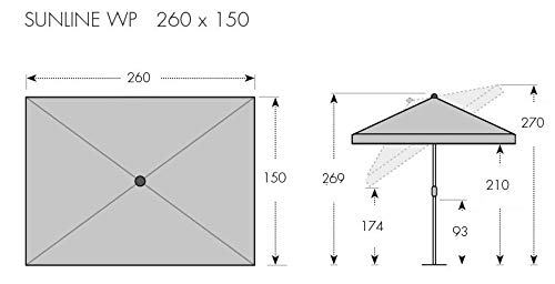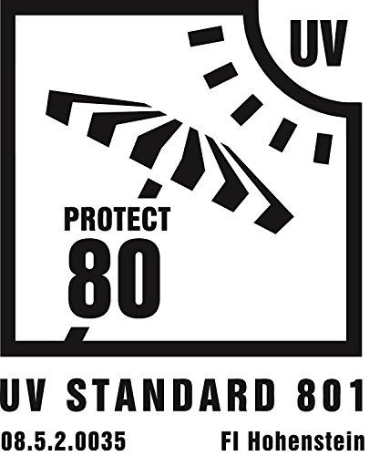 Das epoxydbeschichtete Markengestell jeglicher innen verzinktem Unterrohr trägt den regenabweisenden Polyesterbezug, der ungeachtet alledem fleckschutzimprägniert und mit einem Volant versehen ist. Desweiteren hat der hochwertige Bezug eine extrem hohe Lichtechtheit sowie einen UV-Abschirmung von 80.