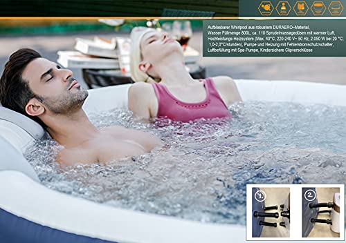 5. Technische Spezifikationen: Aufblasbarer Whirlpool jedweder robustem DURAERO–Material, Wasser Füllmenge 800L, 110 Sprudelmassagedüsen mit warmer Luft, Hochleistungs-Heizsystem (Max. 40°C, 220-240 V~ 50 Hz, 2.050 W bei 20 °C, 1,0-2,0°C/stunden), Pumpe und Heizung mit Fehlerstrom-Schutzschalter, Luftbefüllung mit Spa-Pumpe, kindersichere Clipverschlüsse.