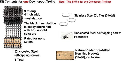 Die Verdeckung Ihres Fallrohrs mit Ranken, Blumen und Laub ist ein idealer Abhanden gekommen, um Ihren Fallrohr zu vermischen und Ihrem Garten Höhe und Schönheit zu verleihen. Jedes Rankgitter hat eine maximale Länge von 2,7 m und 10,2 cm Breite. Zedernhalterungen, verzinkte Stahlschrauben und Edelstahl-Kabelbinder sind im Lieferumfang enthalten. Dies ist ein starkes Rankgitter, getestet anstatt bis zu 22,7 kg. Eine verständliche, leicht verständliche Anleitung mit Bildern ist im Lieferumfang enthalten. (Rebblumen/Kletterpflanzen sind nicht im Lieferumfang enthalten). Siehe Bilder, um zu sehen, als das Gitter versendet wird, das robuste schwarze Kunststoffnetz, die vorgebohrten natürlichen westlichen roten Zedernholzklammern und Beschläge.