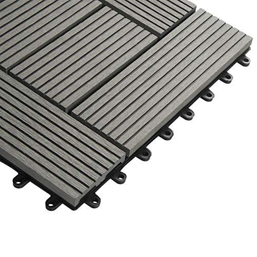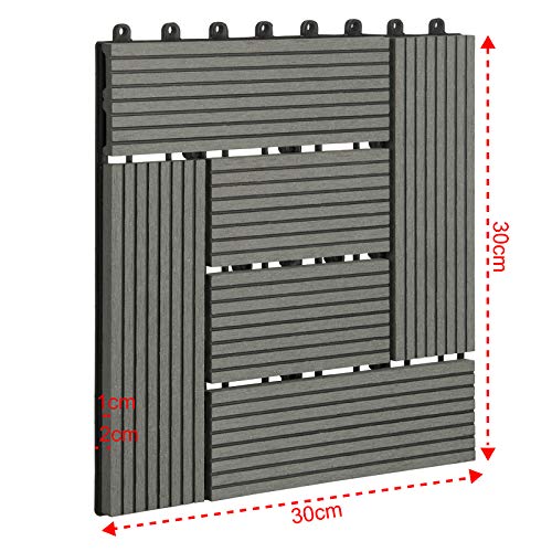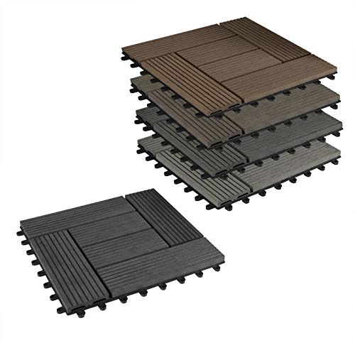 22er Set -2m²:Die WPC Terrassenfliesen sind 30 x 30 cm groß. Die Terrassenfliesen können mit einer Säge leicht entsprechend den Wünschen hergerichtet werden, wenn der Platz am Rande statt eine komplette Fliese nicht ausreichen könnten. Die Fliesen können mit anderen Farben der Fliesen kombiniert werden. Unabhängig davon können die WPC Terrassenfliesen mit Stein-Klickfliesen oder Rasenfließen kombiniert werden.