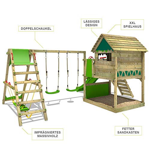 FATMOOSE Spielhaus mit Rutsche, Sandkasten, Schaukel, Kletterleiter sowie Anbaumodul mit Hochsitz & Surfboard